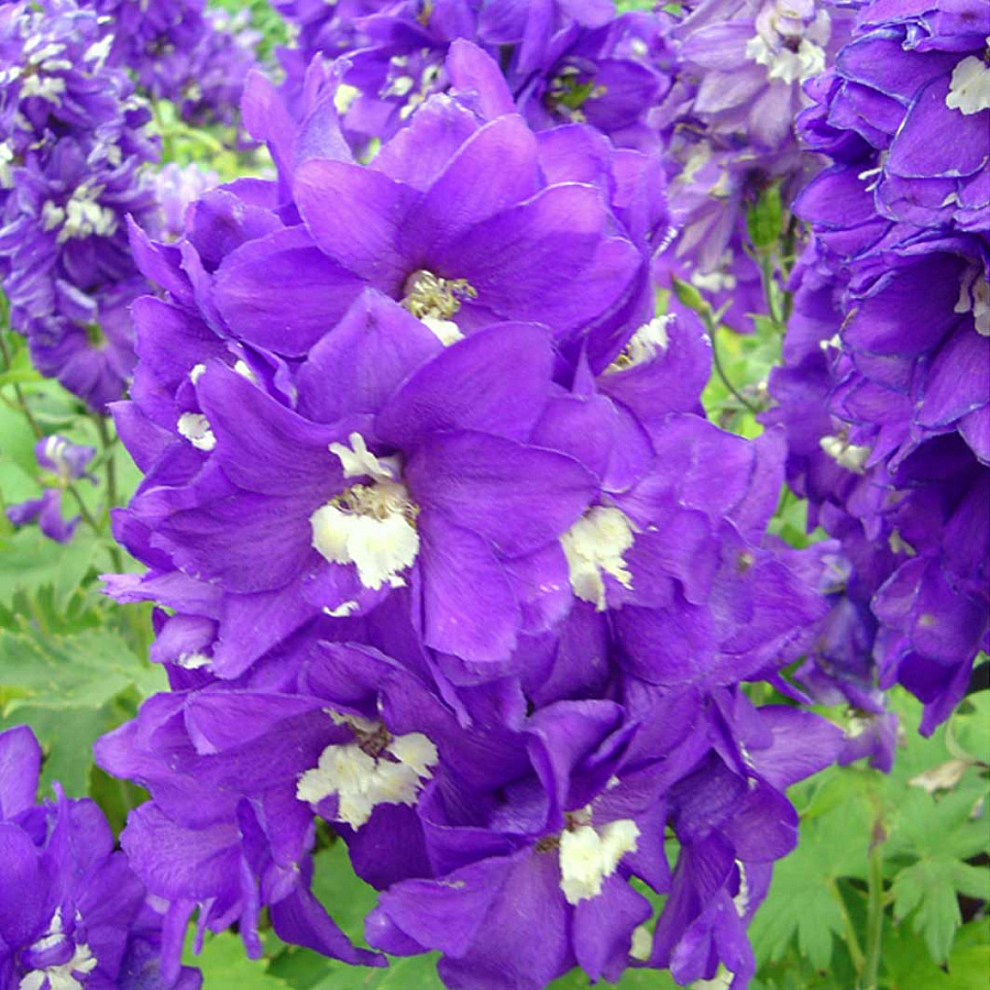 Дельфиниум высокий "Мэджик Фонтэйнс Дарк Блю Вайт Би" - это волшебное растение, которое поразит вас своей красотой и изяществом. Его стебель достигает высоты от 90 до 120 см, создавая великолепный вертикальный акцент в вашем саду. Цветки этого сорта имеют уникальную окраску - глубокий синий с белыми полосками, что придает им особую привлекательность.