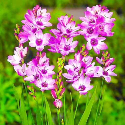 Луковицы иксии гибридной Панорама (Ixia hybrid Panorama) органично впишутся в большинство композиций ландшафтного дизайна – в альпинариях, рабатках, как бордюрное растение. Растение вырастает до 30-40 сантиметров. Листья расположены двурядно. Они плотные, длинные – мечевидной формы. Период цветения иксии – июнь-август. В зависимости от срока посадки длится около 2-3 недель. На прочном длинном медоносе образуется соцветие состоящее из 10-12 ярко-розовых цветков звездчатой формы с рубиново-красным основанием. В срезке иксия сохраняет свежесть не менее 15 дней. Растение хорошо развивается на любых рыхлых почвах, предпочитает солнечные зоны и регулярный полив.