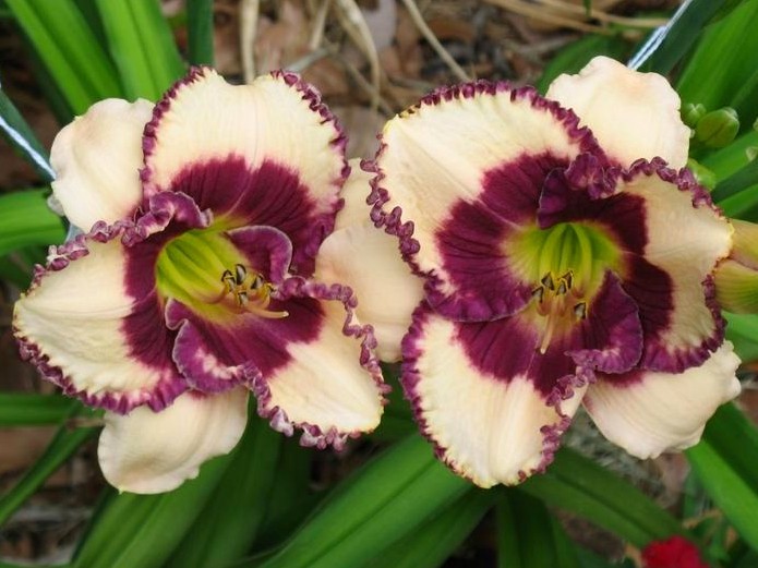 • Окраска цветка : кремовый с темно-сливовым пятном и выразительной каймой, горло зеленое