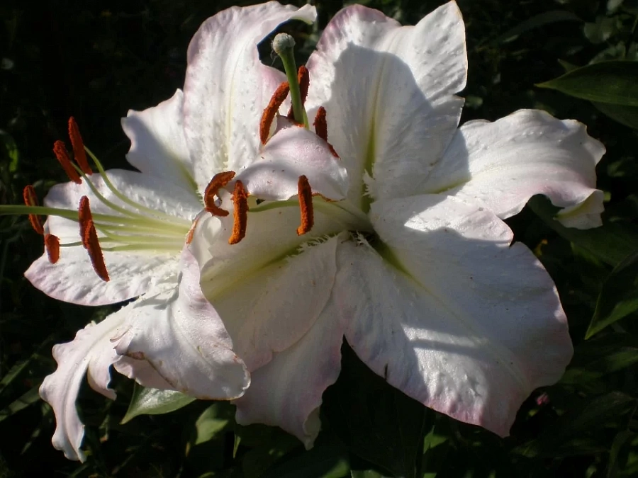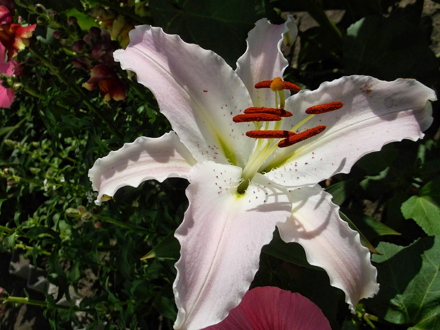• Окраска цветка : розовато-белый с редким крапом и оранжевыми тычинками, гофре по краю