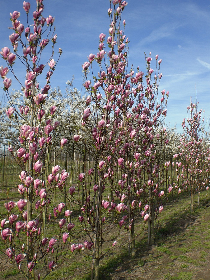 Саженцы магнолии гибридной Ред Лаки (Red Lucky) вырастают в густые кустарники, обильно цветущие крупными ароматными цветками. Лепестки цветов снаружи нежно-сиреневые или красноватые, внутри белые, с фиолетовыми тычинками. Листья появляются одновременно с цветками, имеют правильную форму овала, глянцево-зеленые. Форма взрослого кустарника или дерева - компактная, ветвление густое. Средний рост крупномеров магнолии гибридной ред Лаки составляет 4-6 метров. Достоинства: