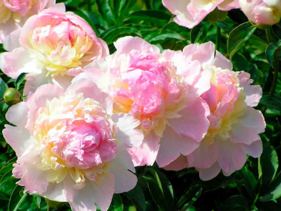 Саженцы пионов Распберри Сандей (Raspberry Sundae) высаживают как на переднем плане цветника, создавая акцент на теплых красках. Высотой куст средний около 70-90 см в длину. Цветок состоит сразу из желтого, белого и розовых оттенков. Все цвета нежные и гармонично дополняют друг друга. Лепестки разные: нижний ряд крупный, серединка состоит из небольших лепестков сильно махровая и венец средний. Необычность бутона не единственное, что привлекает внимание, ведь в диаметре он может достигать до 18 см. После пересадки саженцев пионов "Распберри Сандей" сортовые качества проявляются на 2-3 год.